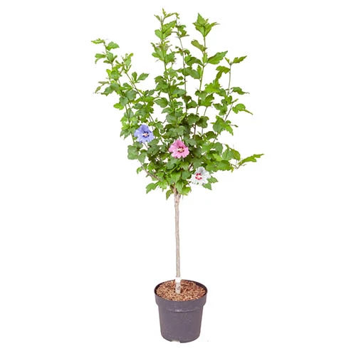 Hibiscus produce the most amazingly exotic looking flowers, and this impressive standard has been expertly created by grafting blue, pink and white hibiscus onto a single stem. All three have a similar growth rate and flowering time, so you?ll get all three colours at once.